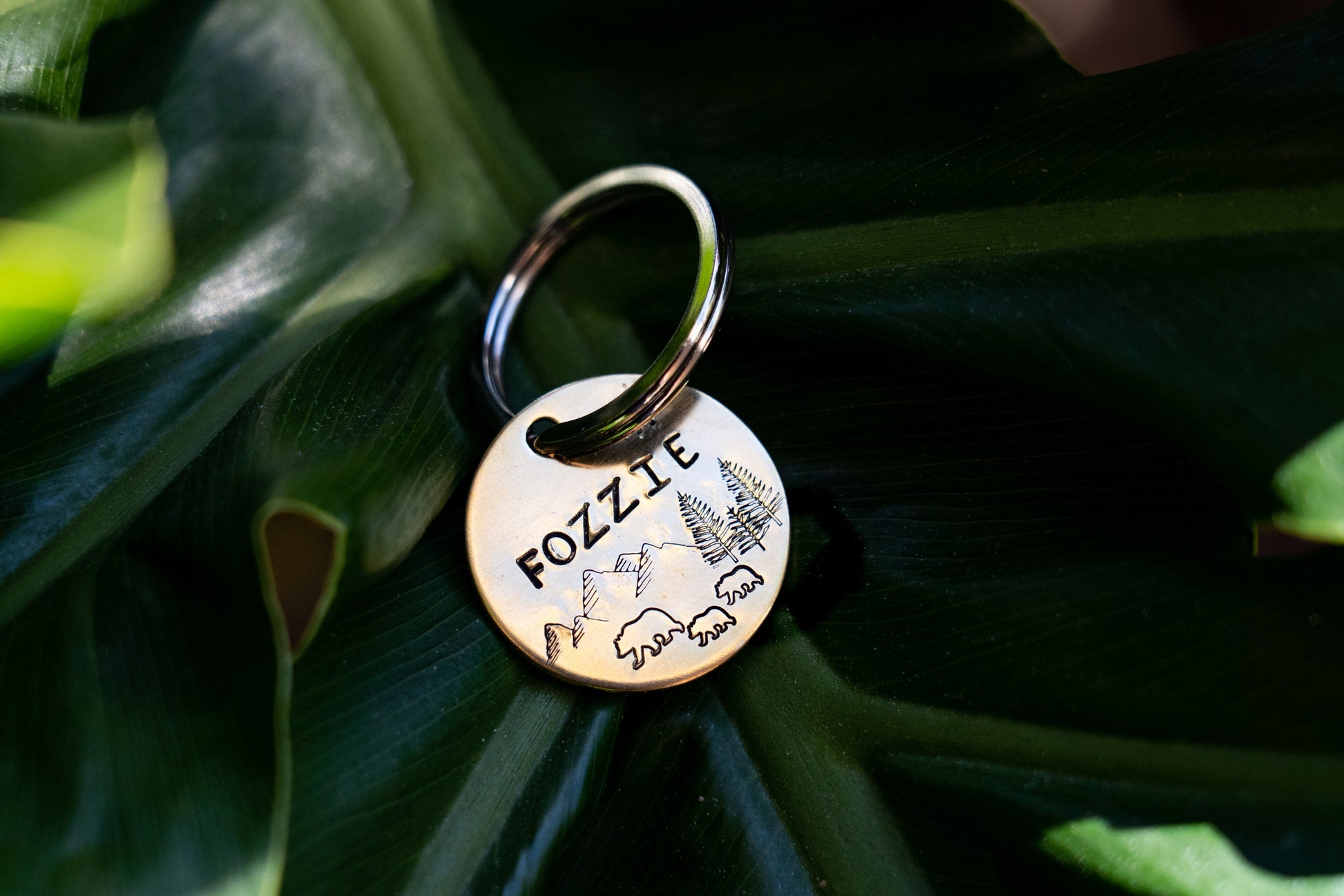 This name tag features a bear family with mountains and trees in the background. All tags come with one split ring. You can choose copper, nickel silver, or brass tags, and choose your preferred name font. This is a circular 1.125" tag.