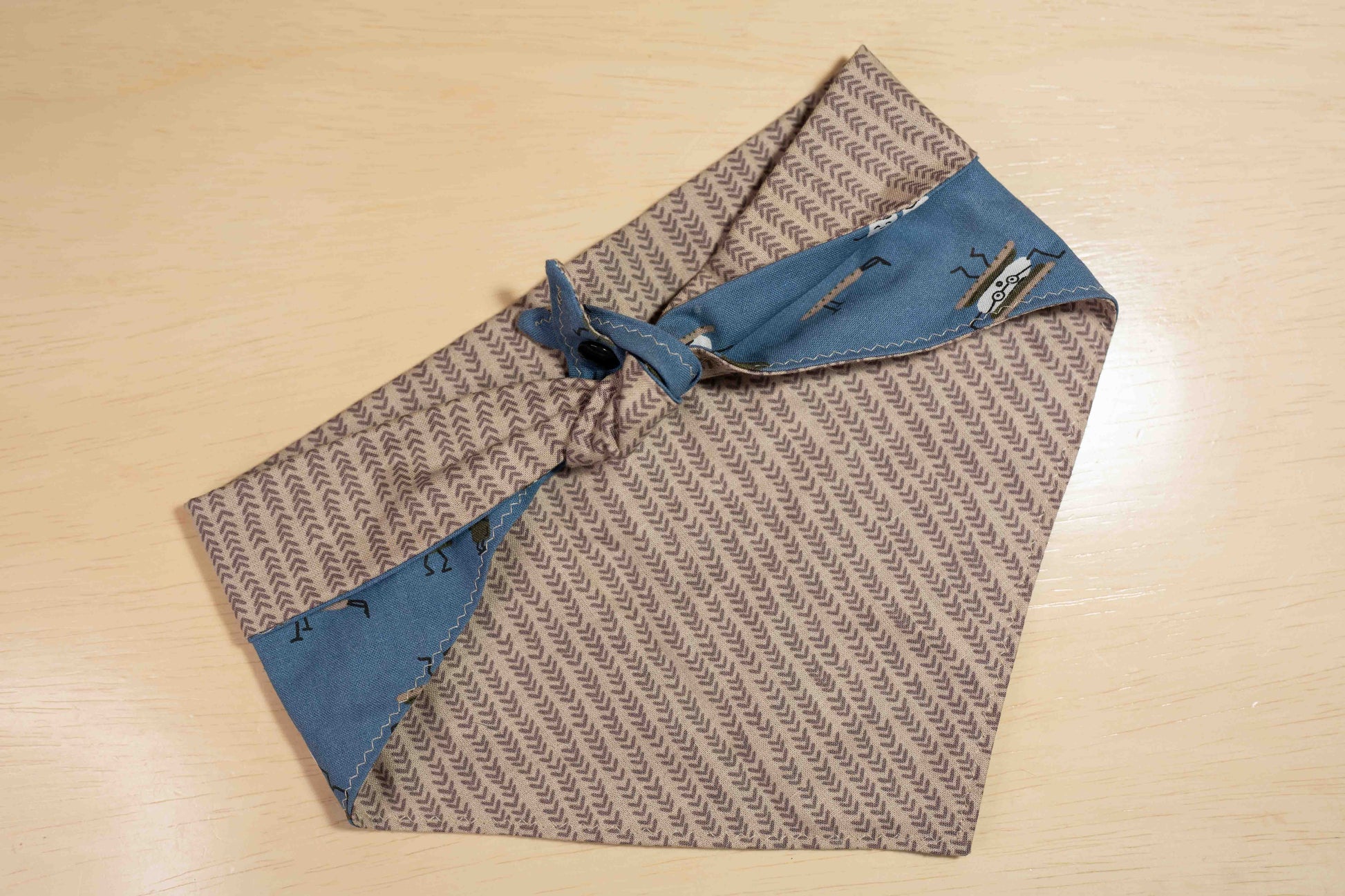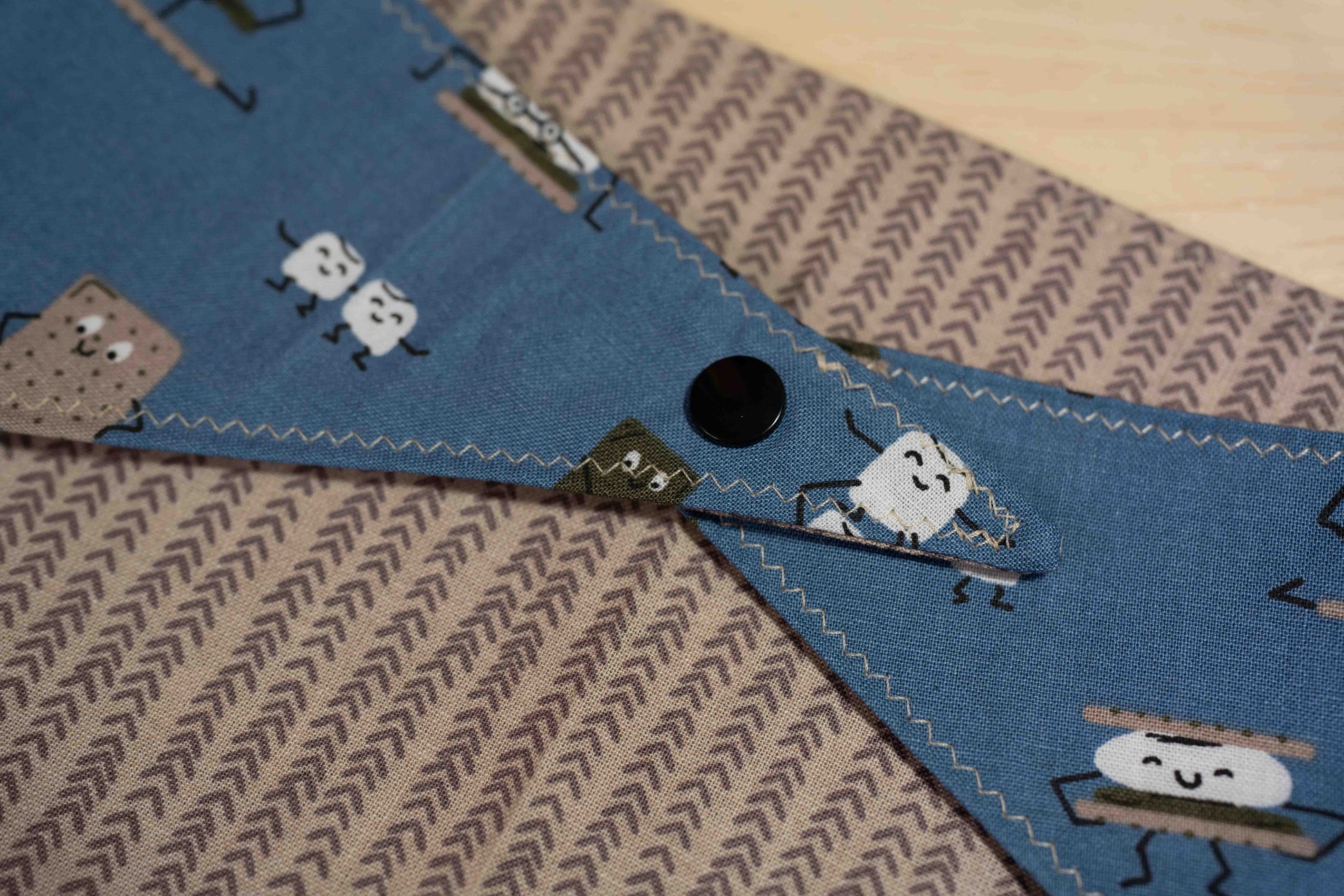 Bandanas are made with flexible sizing to fit a wide variety of pets and can be worn multiple different ways! The camping buddy bandana features a s'mores print and a brown backing. Every bandana comes with one set of snaps for easy wear. Sizes are approximate and every bandana varies.