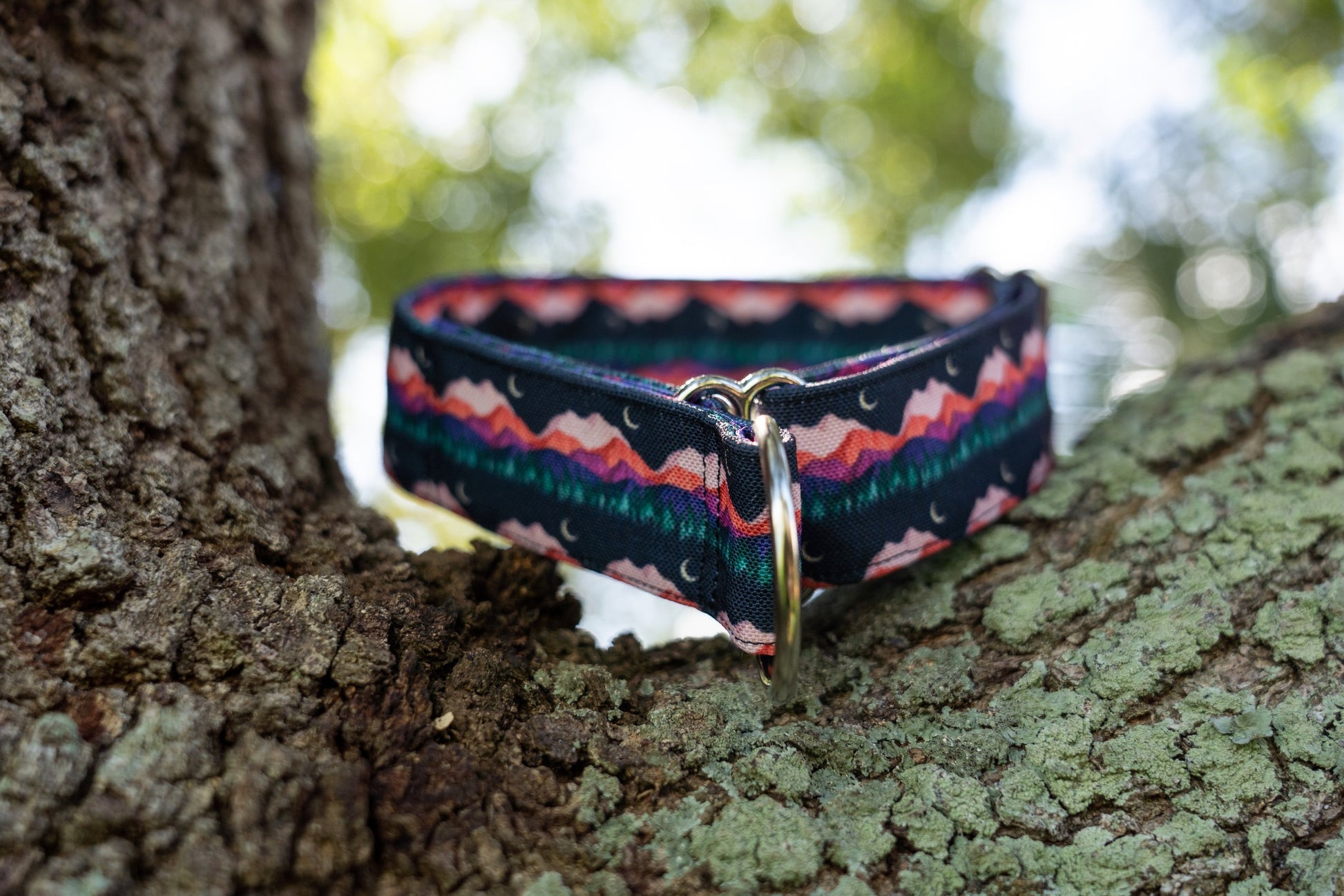 The mountains eco canvas print features a row of mountains and trees with the moon above, on our durable eco canvas fabric. Eco canvas fabric is made with recycled plastic bottles, so if you are looking for an eco friendly dog collar, look no further! All collars are handmade to order. Each collar will be unique. Some prints vary more than others, so please keep this in mind!