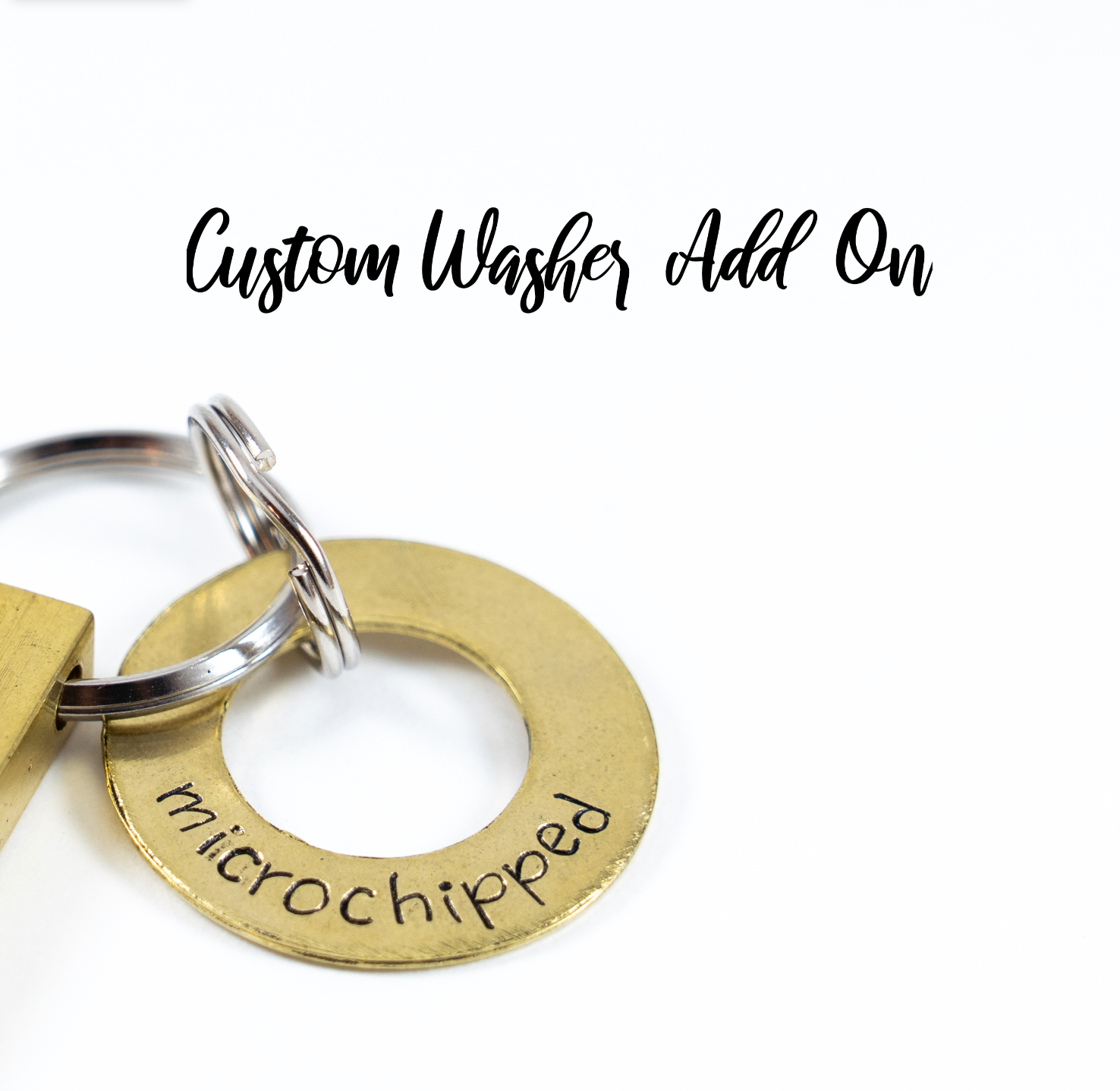 All tags come with one split ring. You can choose copper, nickel silver, or brass tags, and choose your preferred name font. This is a circular 1.125" tag.