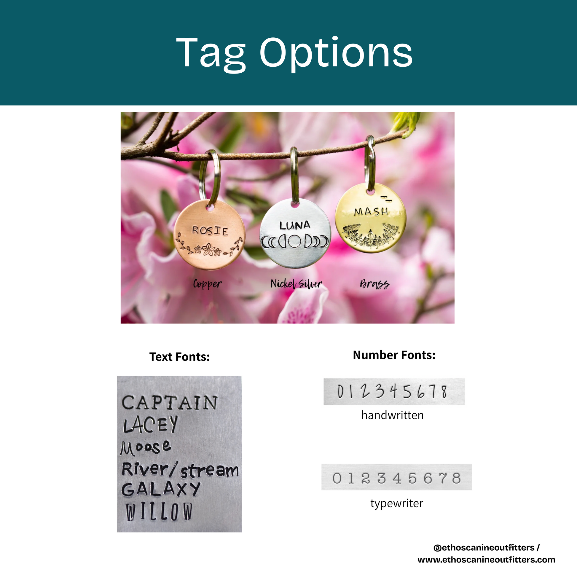 All tags come with one split ring. You can choose copper, nickel silver, or brass tags, and choose your preferred name font. This is a circular 1.125" tag.
