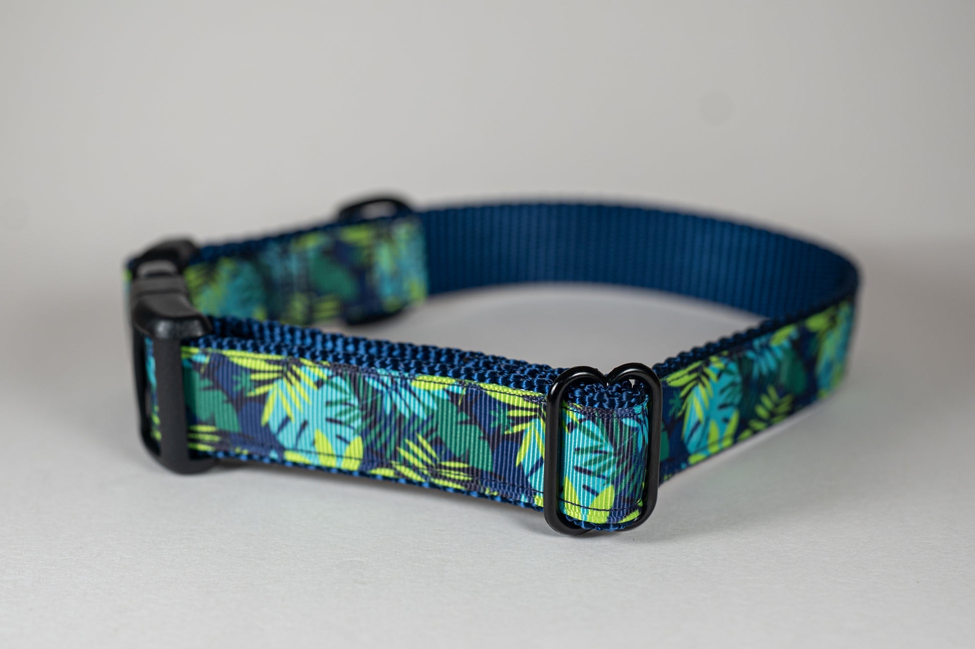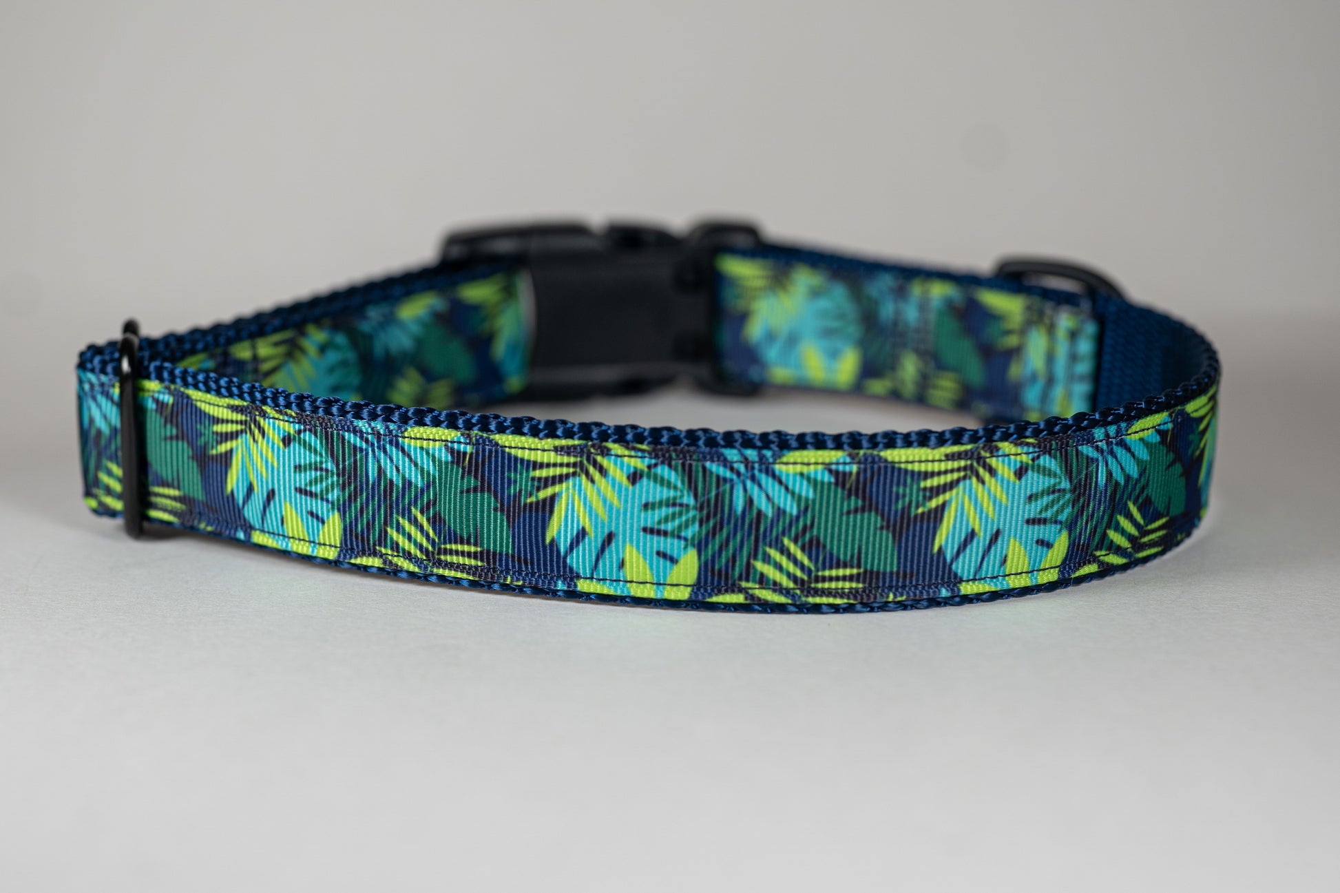 This cute tropical leaves pet collar features monstera leaves and ferns and brings vibes of a tropical rainforest. This collar is pictured using a navy webbing background and black hardware. This collar is 1" width.