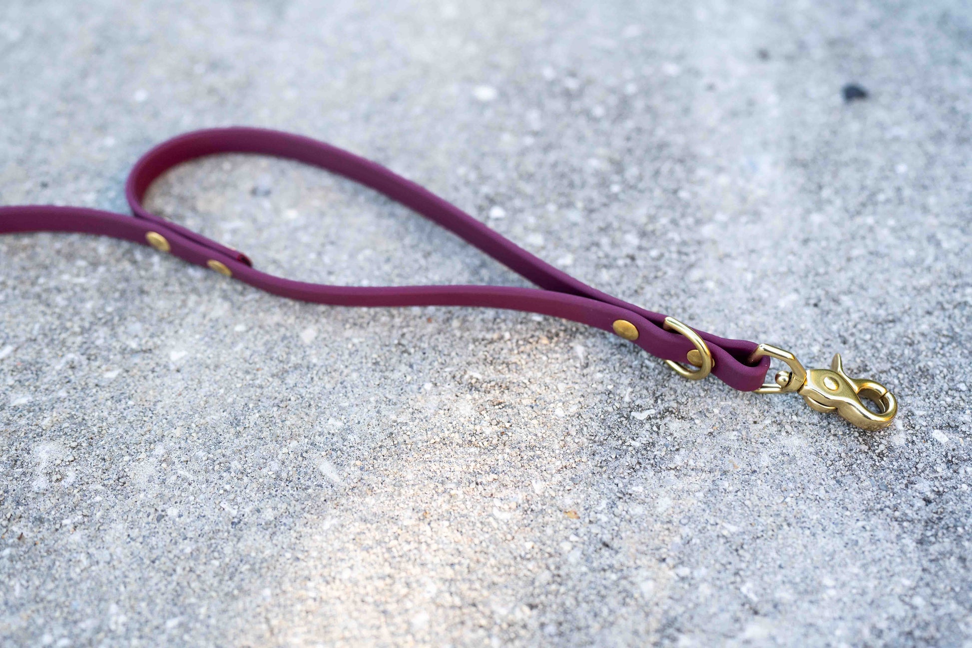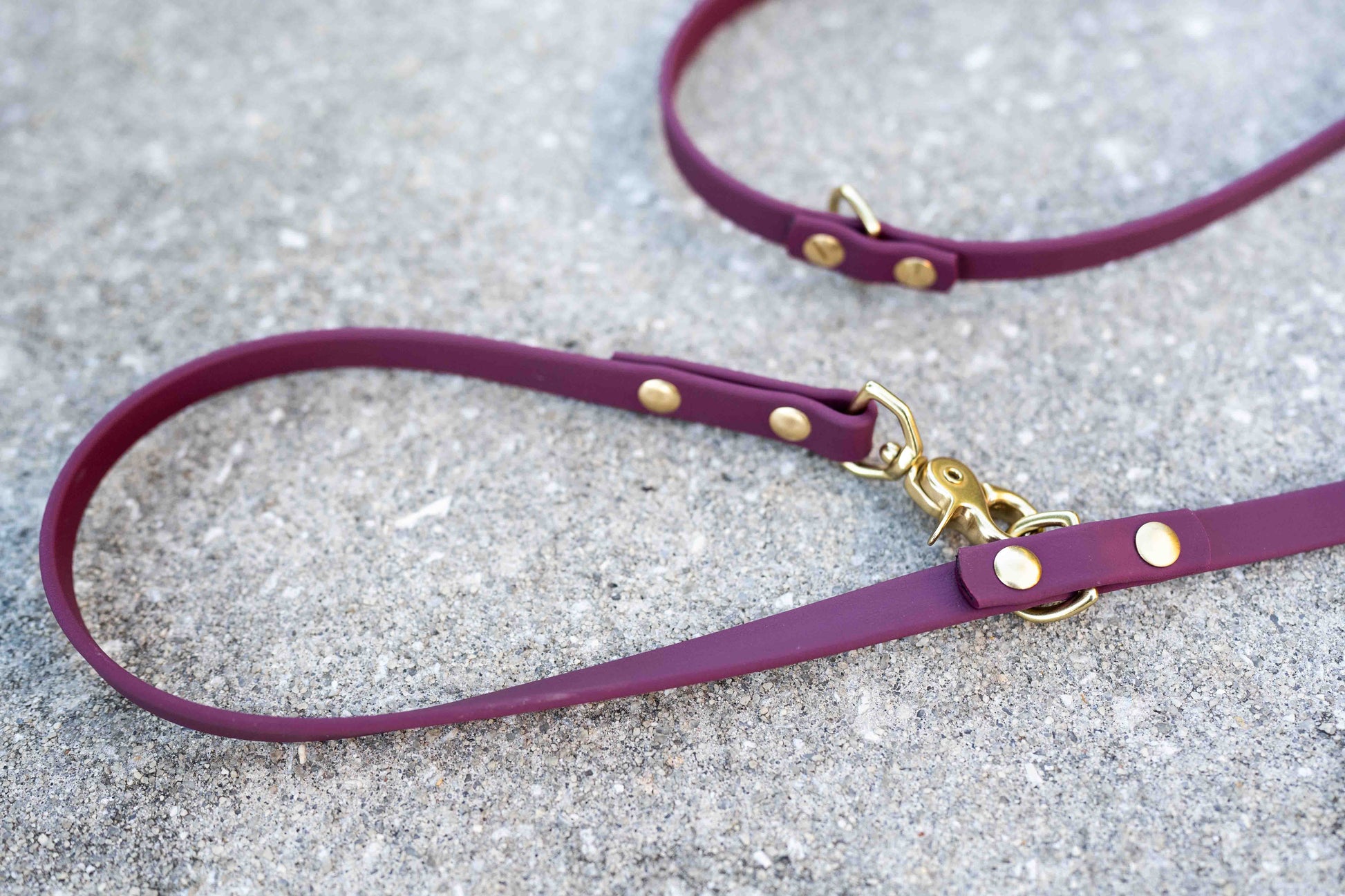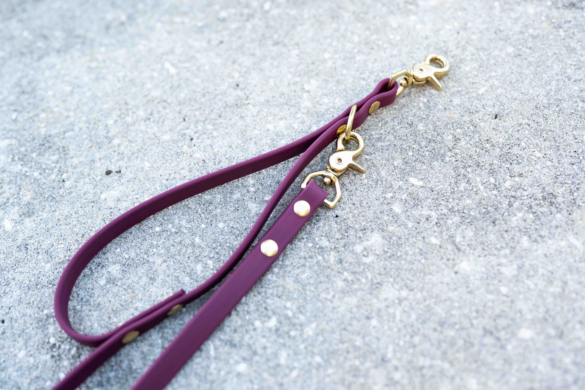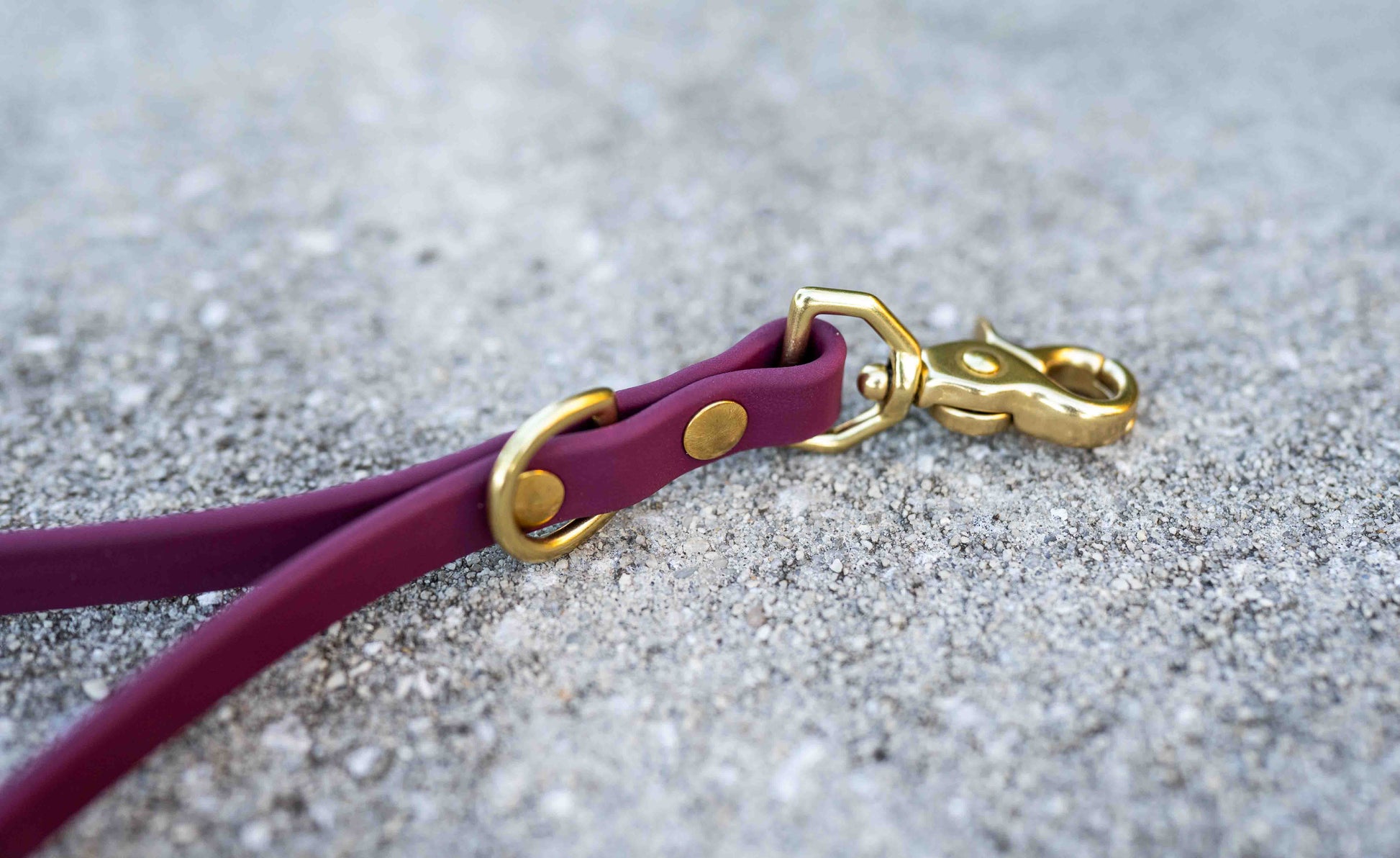 This leash is handmade with solid brass hardware and authentic BioThane. This is super heavy BioThane for a softer hand feel, and is 5/8" width. The carabiners are aluminum.