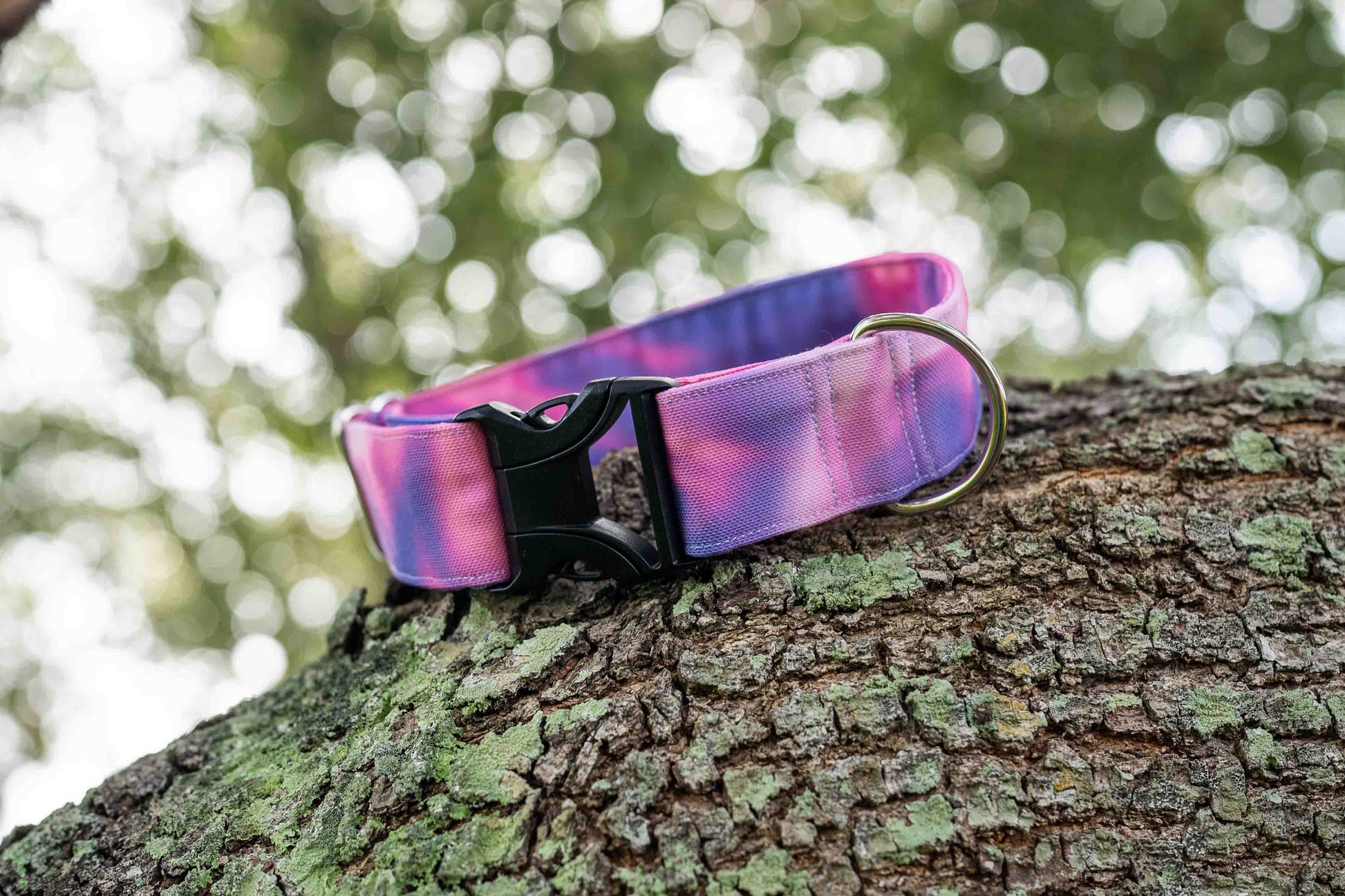 The whimsy eco canvas print features abstract pink and purple swirls on our durable eco canvas fabric. Eco canvas fabric is made with recycled plastic bottles, so if you are looking for an eco friendly dog collar, look no further! All collars are handmade to order. Each collar will be unique. Some prints vary more than others, so please keep this in mind!
